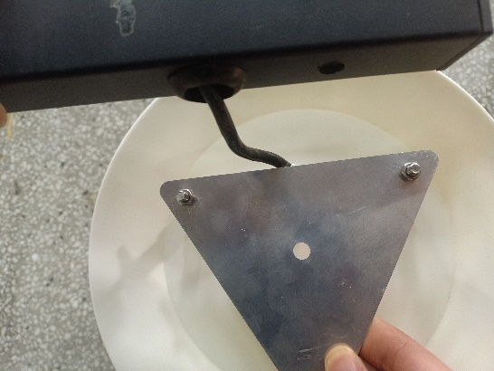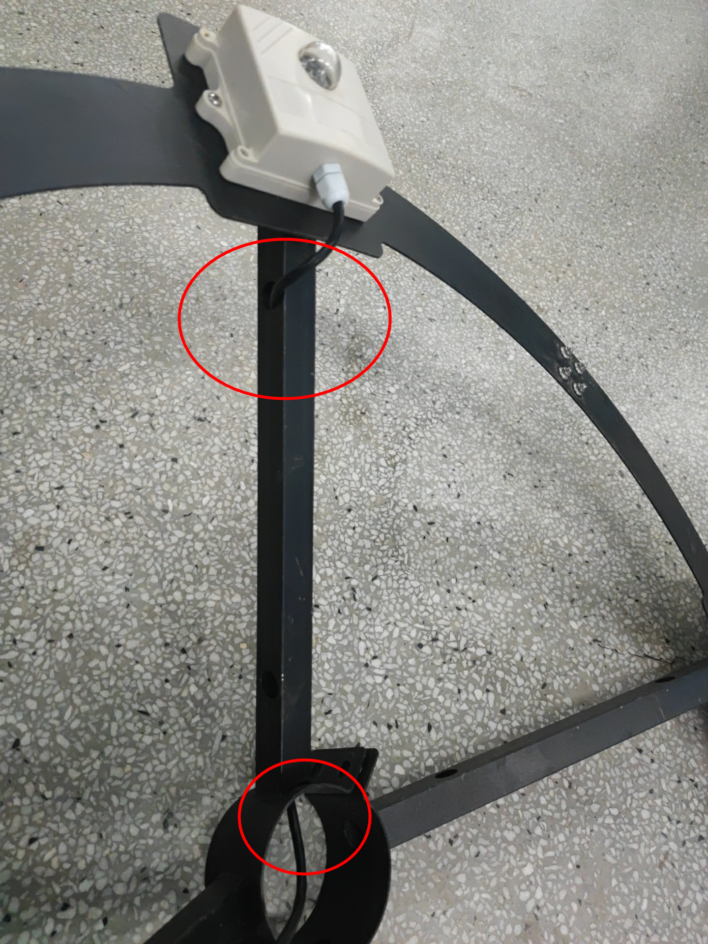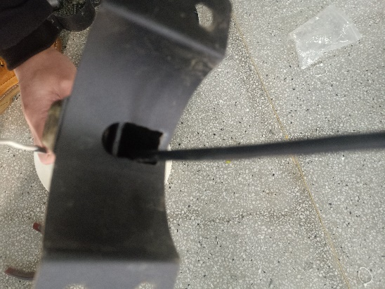 13、安裝固定圓盤(pán)支架并穿線,先將圓盤(pán)支架中間四個(gè)螺絲拆卸,然后將圓盤(pán)支架從燈桿上方套到燈桿上,光照傳感器朝向控制箱方向,將傳感器線從對(duì)應(yīng)的進(jìn)線孔(距燈桿頂端1m)穿進(jìn)燈桿,從控制箱的出線孔(離燈桿底座1.2m)穿出燈桿,最后將圓盤(pán)支架4個(gè)穿線孔與燈桿的4個(gè)進(jìn)線孔對(duì)齊,固定4個(gè)螺絲并擰緊,注意不要壓到線
