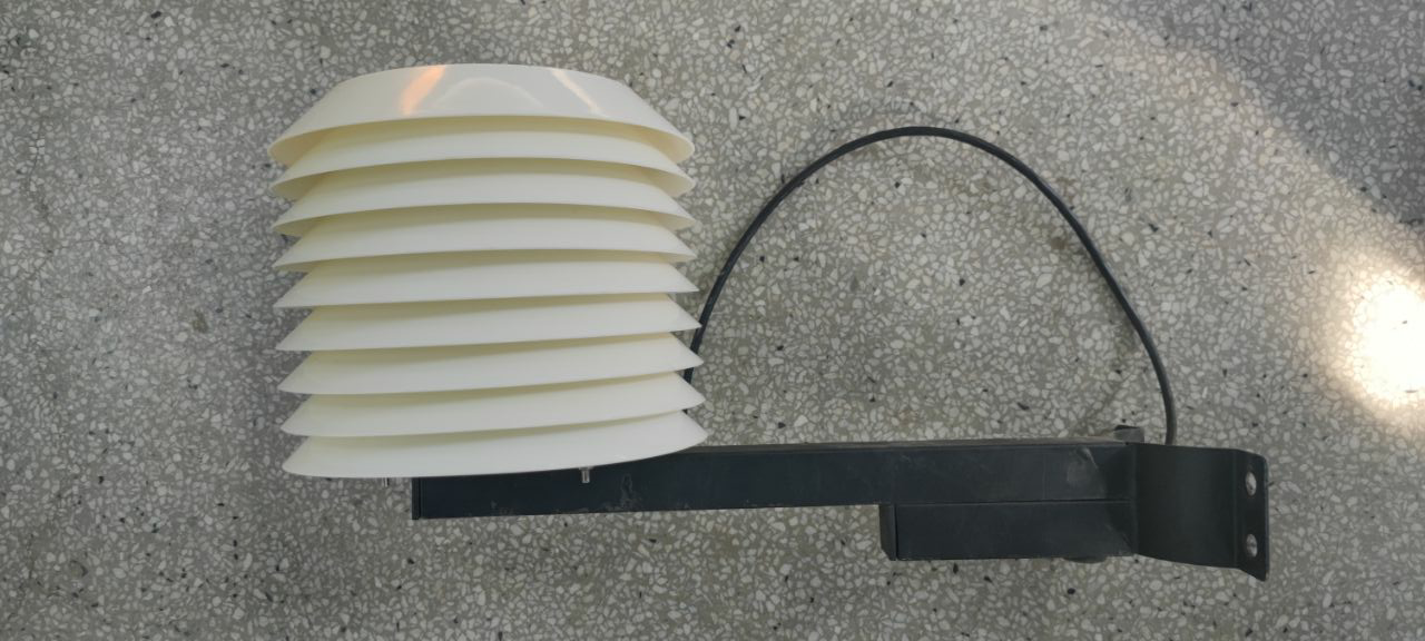 17、安裝固定百葉箱并穿線,將傳感器線從百葉箱進(jìn)線孔(離燈桿底座1.5m、控制箱對(duì)面)穿入燈桿,從控制箱出線孔(離燈桿底座1.2m)穿出,然后固定支架并擰緊螺絲,注意百葉箱方向朝上