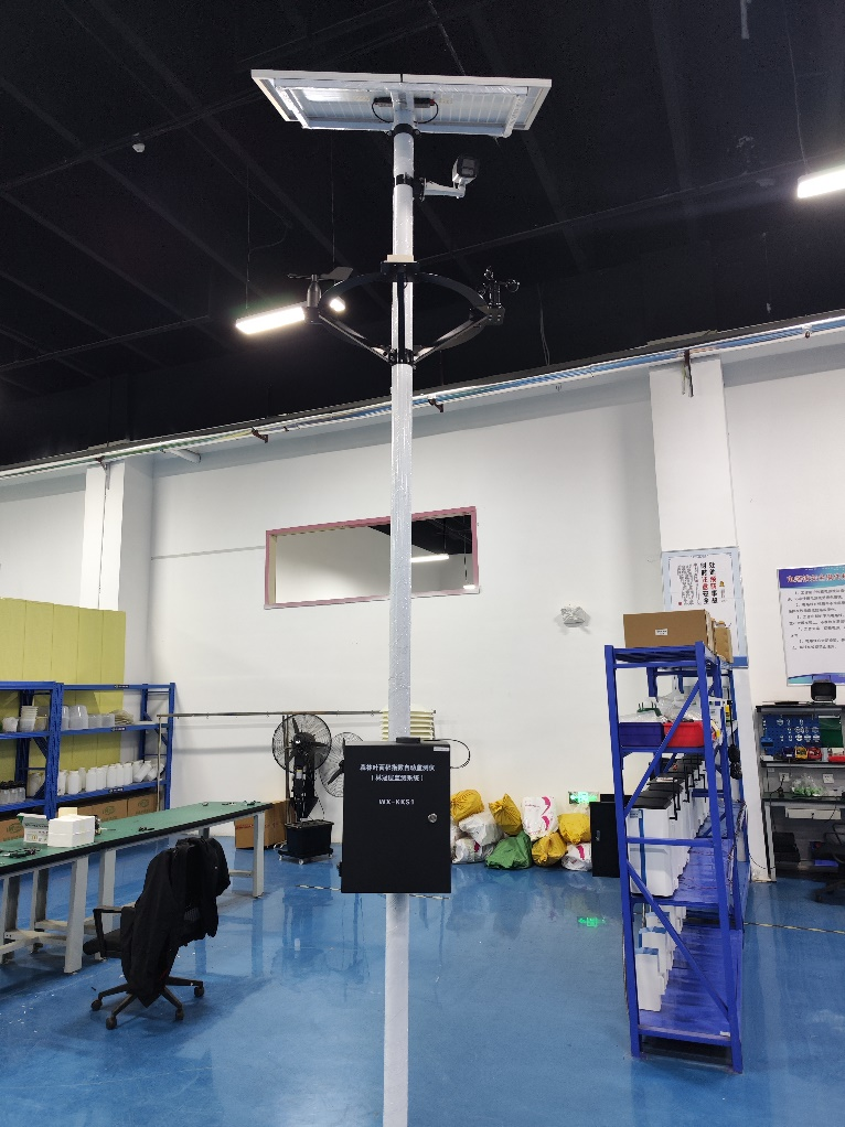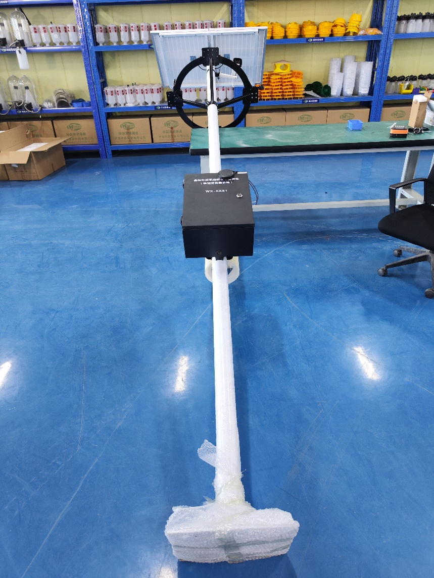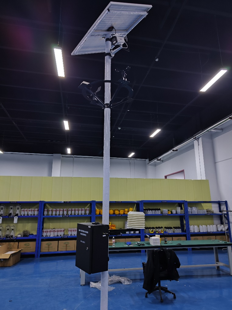 20、設(shè)備安裝完成(注:電池線從燈桿底部穿入控制箱;葉面溫濕度傳感器線從控制箱底部穿入控制箱,傳感器固定于樹(shù)枝枝干上)